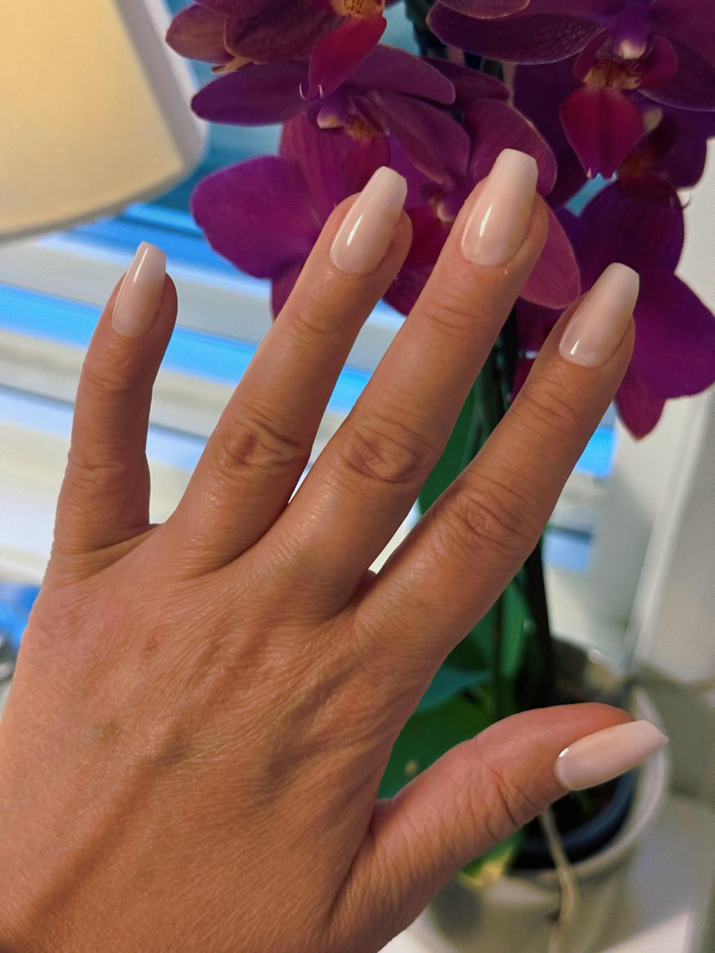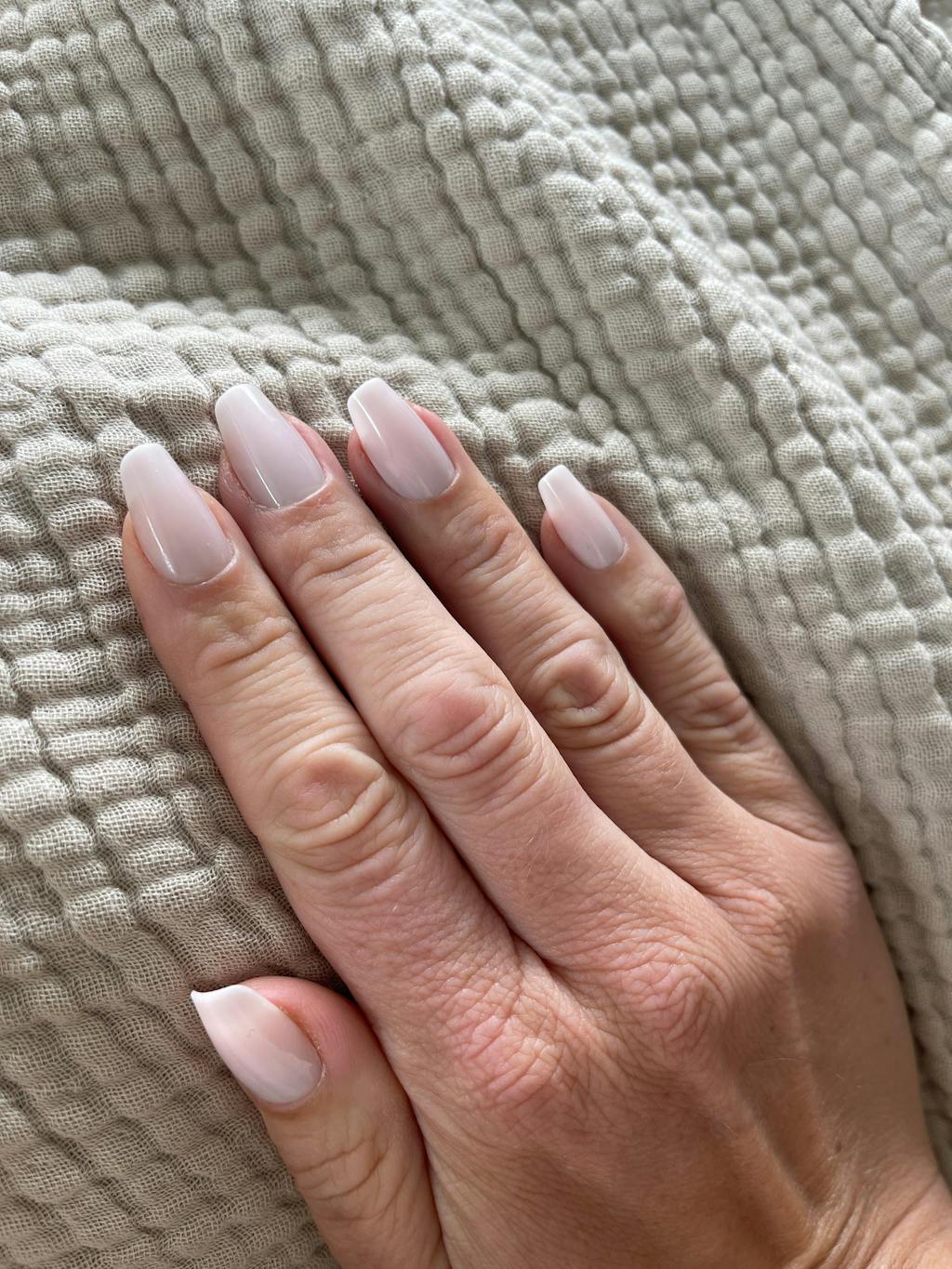 Marshmallow are the perfect nails for a minimalistic, natural look with their milky, white color and soft pink undertone. This model has a milky semitransparent finish with a low opacity.