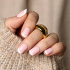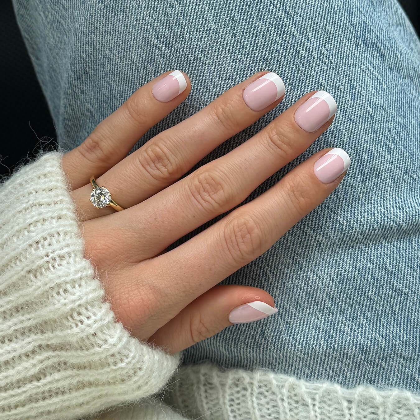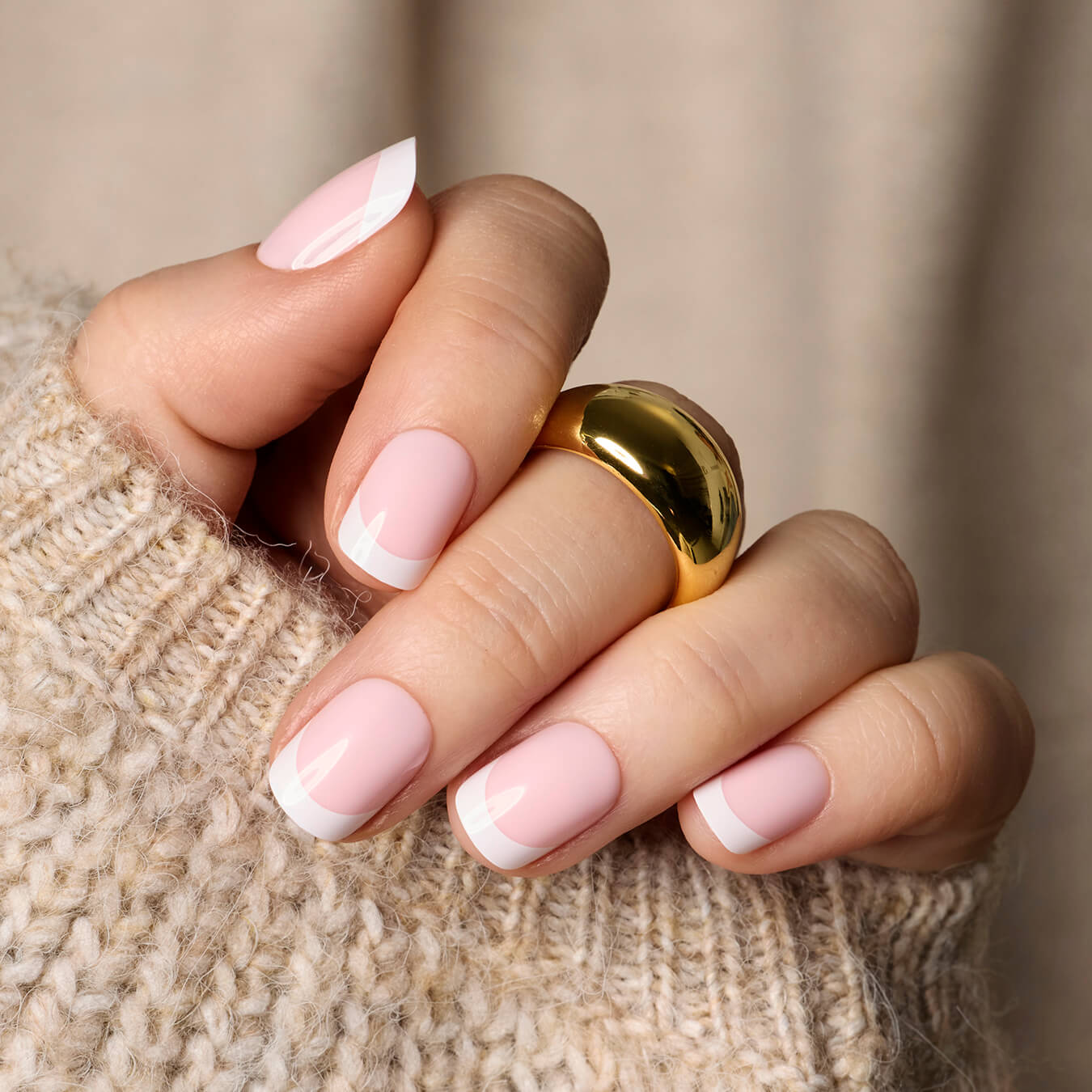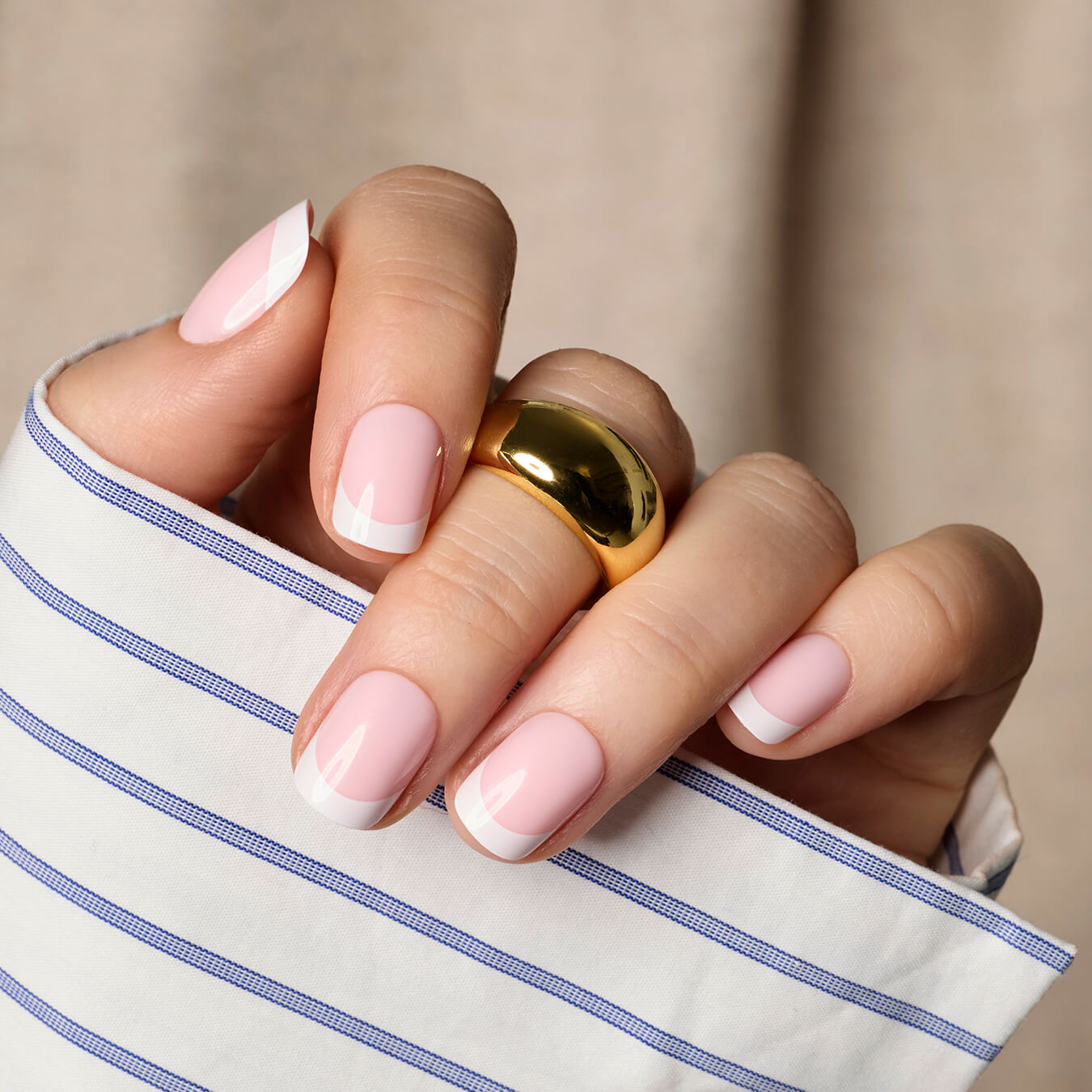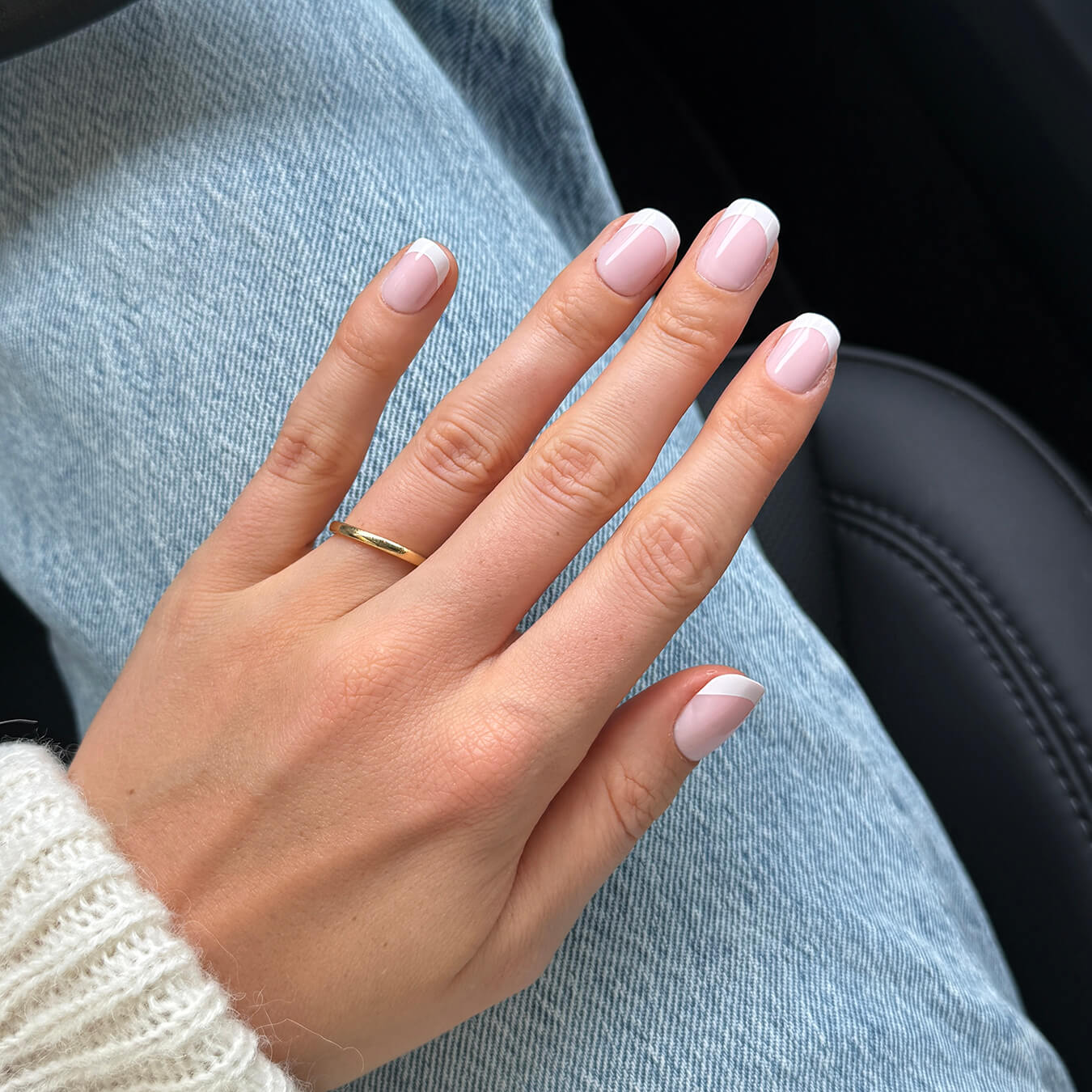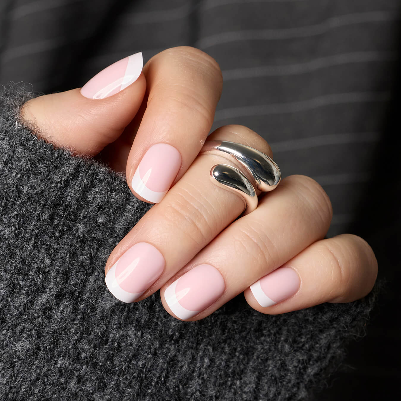 Ajaton ranskalainen manikyyri pehmeän vaaleanpunaisella pohjalla ja viileänsävyisellä pohjavärillä – elegantit ja vaivattomat.