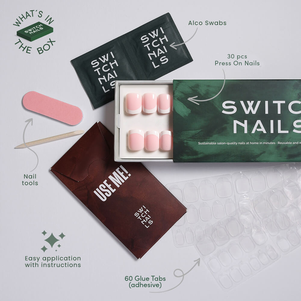 Painetut kynnemme on valmistettu kierrätetystä ABS-muovista, jonka päällä on design ja geelipinnoite, joka antaa vaikutelman salongigeelimanikyyristä! Kun on kyse malleistamme, joissa on pohjaväristä eroava maalattu kuvio, suosittelemme käyttämään suosikkipäällyslakkasi päälle kulumisen välttämiseksi, jotta voit käyttää kynsiäsi uudelleen useaan otteeseen. Oikealla sovelluksella ja istuvuudella saat pitkäkestoisen tuloksen jopa 1-2 viikkoa!